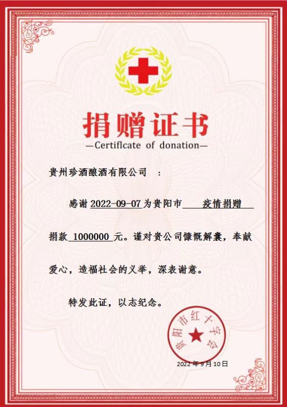 9月7日,貴州珍酒向貴陽(yáng)市紅十字會(huì)捐贈(zèng)人民幣100萬(wàn)元,支援貴陽(yáng)市疫情防控工作。